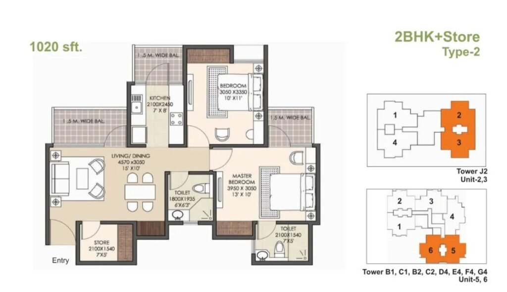 | 3BHK + 3T + STORE | 1735 SQ.FT. |